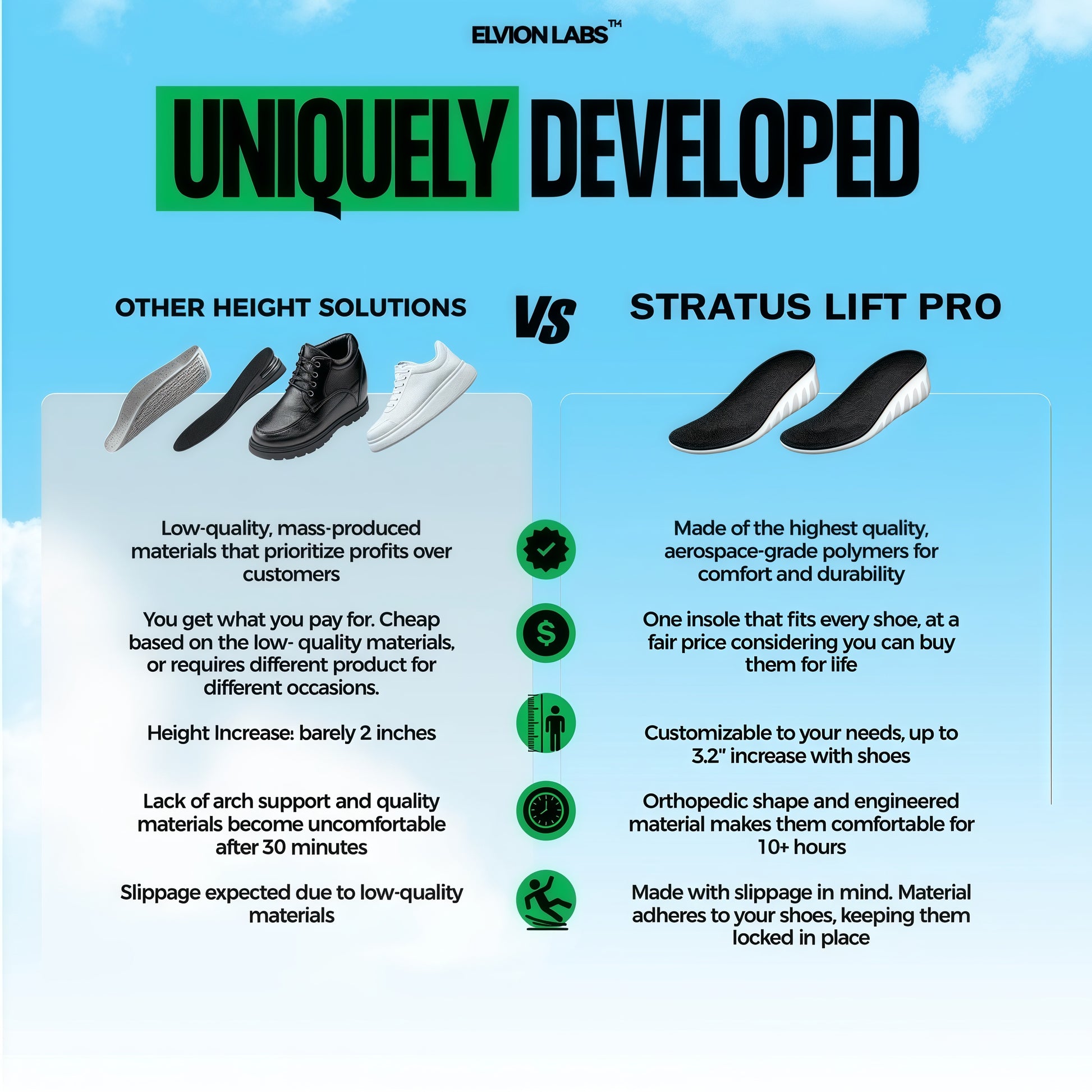 To make sure you get the perfect height boost, we offer two options so every customer finds the right fit:If you ever want to upgrade or downgrade heights, just let us know — we’ll send you new ELVION LIFT PROinsoles and refund your original order, no questions asked.We also recommend trying our 3-height bundle, which includes one of each height. That way, you can test them and see which height feels best for you.